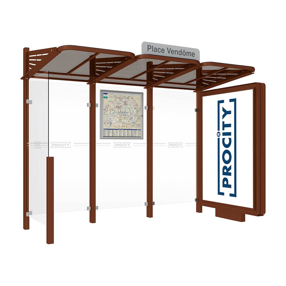 Découvrez Station bus Conviviale bardages verre Aspect Corten - Caisson lumineux VIP à droite et bardage à gauche - PROCITY - 529366.S025 disponible à l'achat