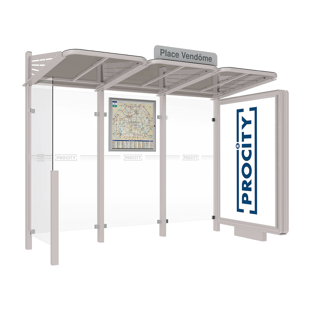 Découvrez Station bus Conviviale bardages verre RAL7044 - Caisson lumineux VIP à droite et bardage à gauche - PROCITY - 529366.7044 disponible à l'achat