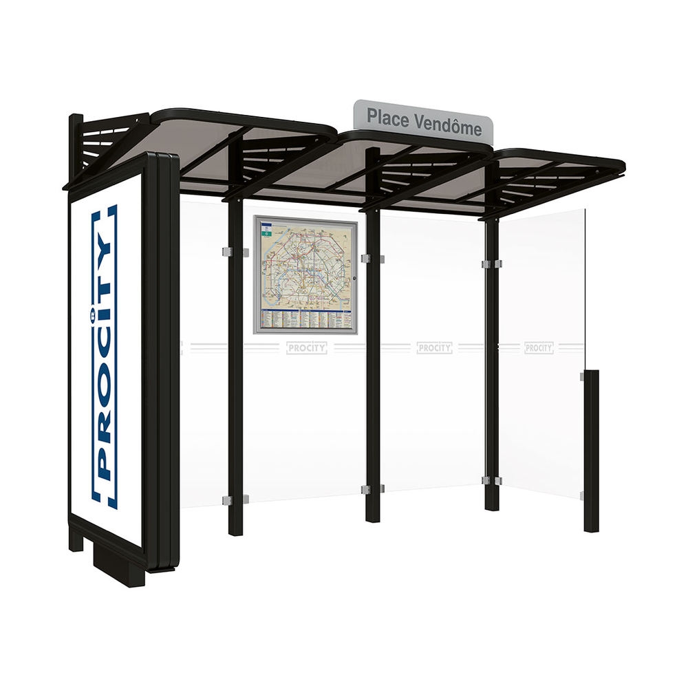 Découvrez Station bus Conviviale bardages verre RAL9005 - Caisson lumineux VIP à gauche et bardage à droite - PROCITY - 529388.9005 disponible à l'achat