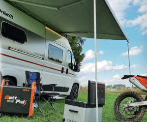 Batterie mobile LiFePO4 d'une capacité de 4,8 kWh, offrant une puissance de sortie en alimentation continue de 5 kW et une pleine puissance de 7,5 kW pendant 10 secondes. Elle dispose de deux prises 230 V, 16 A, 50 Hz, ainsi que de ports USB-A 5 V et USB-C 12 V. Le temps de charge sur une prise 230 V est de 3 heures, réduit à 2 heures sur une station de recharge EV 5 kW. La batterie supporte plus de 6000 cycles de charge.