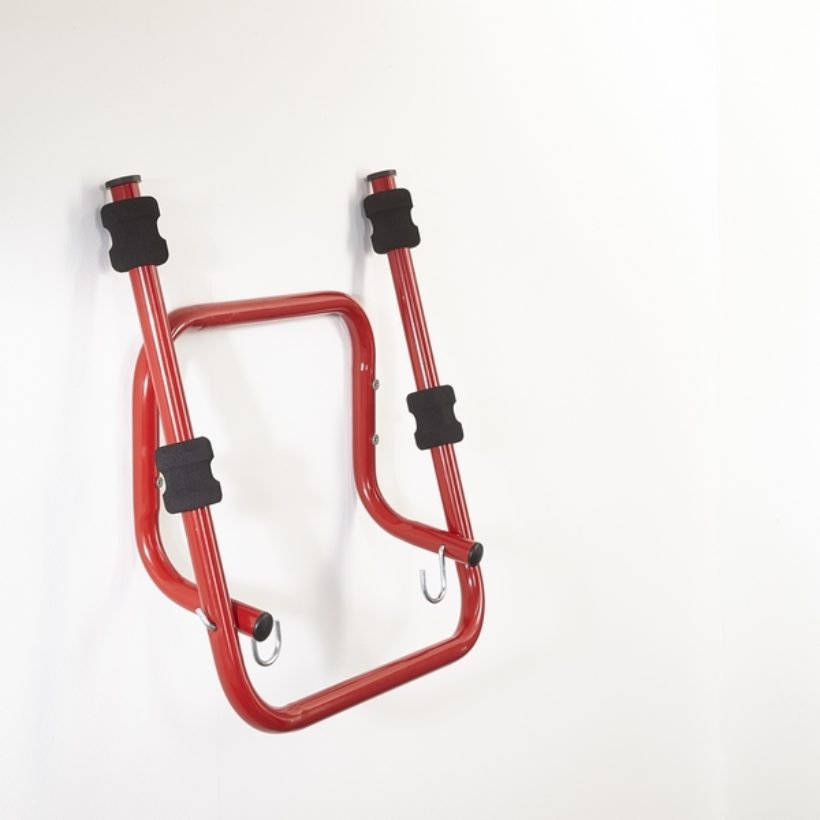 Conçu en tube acier avec une finition poudrée, il est équipé de 4 mousses haute densité pour protéger vos vélos. Ses dimensions sont de 46 cm de largeur, 50 cm de profondeur (16,5 cm en position repliée) et 31 cm de hauteur (50 cm replié). Pratique, il dispose aussi de 2 crochets pour ranger vos accessoires comme un casque ou un gilet. Notez qu'il n'est pas compatible avec les présentoirs.