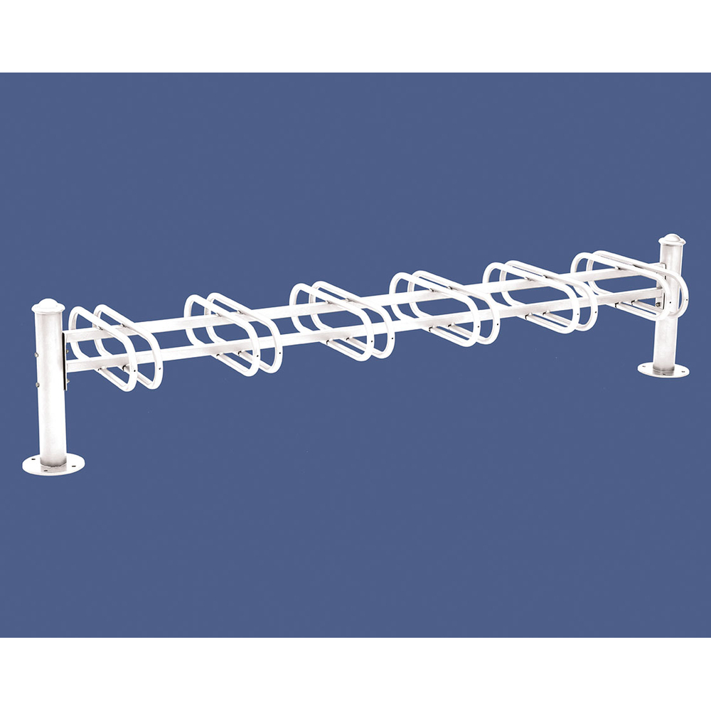 Ce support à vélo est proposé en configurations de trois ou six places, bénéficiant d'une structure double face. Sa longueur est de 1320 mm pour le modèle trois places et de 2457 mm pour le six places. Conçu en acier robuste, il possède des potelets de 76 mm de diamètre et des griffes de 22 mm, assurant une excellente stabilité et résistance. L'écart entre les arceaux est de 50 mm, ce qui permet d'accueillir différents types de cycles sans contrainte.