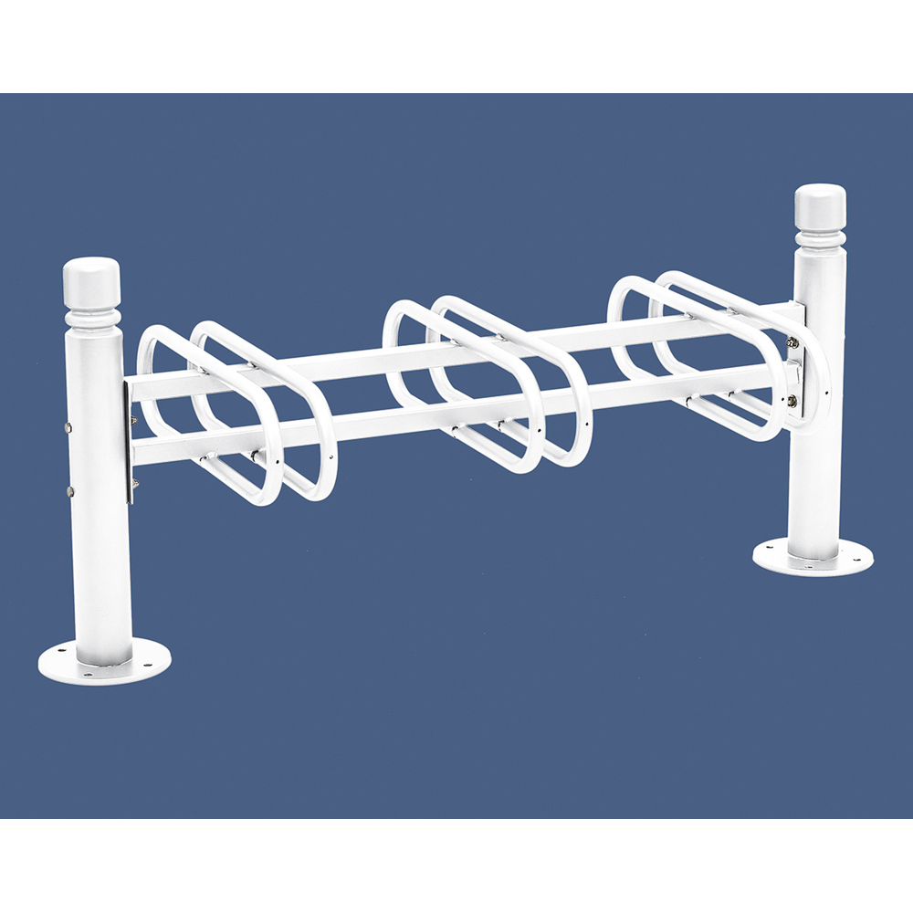 Ce modèle est disponible en configurations de 3 ou 6 places, avec une option simple ou double face pour s'adapter à vos besoins. La longueur du support est de 1320 mm pour la version 3 places et de 2457 mm pour la version 6 places. Sa structure robuste en acier comprend un potelet de diamètre 76 mm et des griffes de 22 mm qui garantissent une fixation solide.