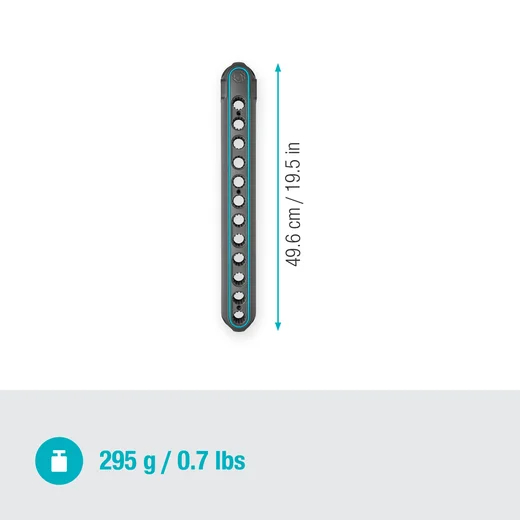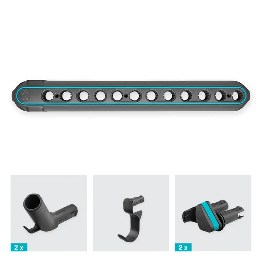 Le support mural FLEX de GARDENA est conçu pour offrir une solution de rangement pratique et peu encombrante pour vos outils de jardin, tout en optimisant l'espace disponible. Ce support permet de ranger efficacement les outils de la gamme combisystem ainsi que les accessoires et produits du système Original GARDENA. Il est équipé de deux porte-outils flexibles, qui peuvent être tournés par pas de 30°, permettant ainsi un ajustement facile en fonction de vos besoins. Ces porte-outils sont accompagnés de crochets pratiques pour y suspendre des sécateurs et autres petits outils de jardin.