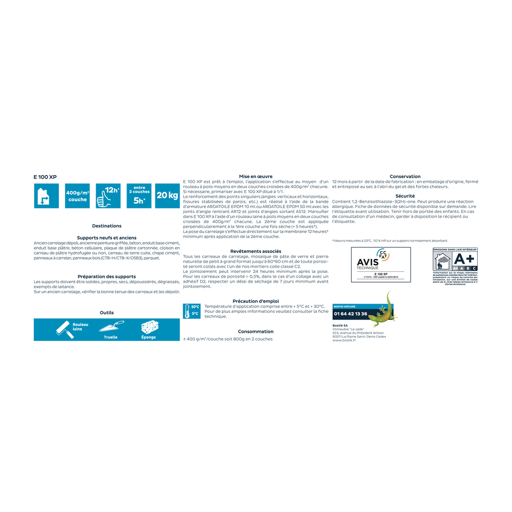 Découvrez le Système de protection à l'eau sous carrelage E 100 XP de BOSTIK, un produit innovant de 20 kg, conçu pour assurer une barrière efficace contre les infiltrations d'eau.