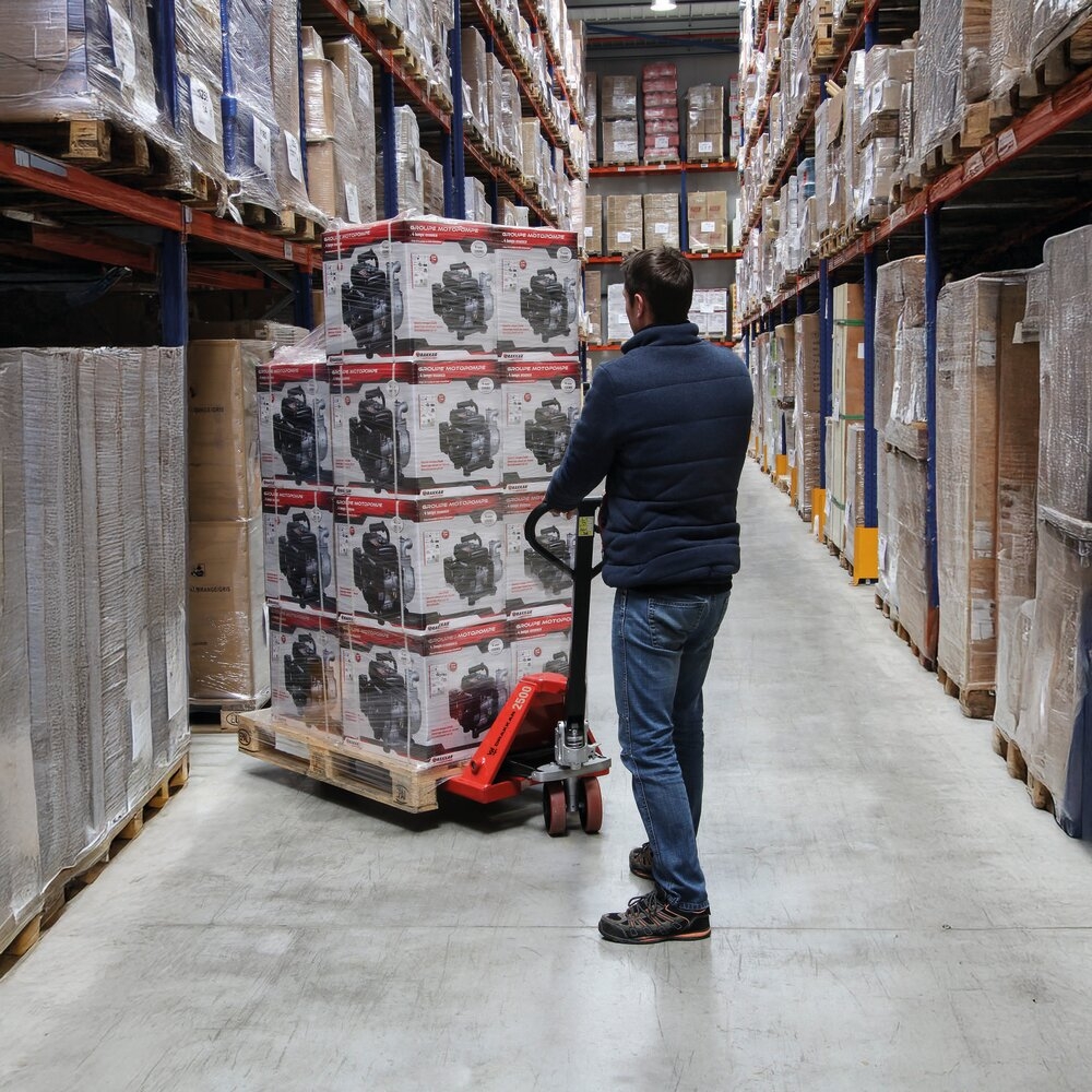 Le transpalette est conçu pour une utilisation manuelle en manutention et rangement, garantissant une bonne maniabilité et une robustesse adaptée aux charges lourdes. Les matériaux utilisés, notamment les jantes en acier, assurent une longue durée de vie dans des conditions normales d'utilisation.