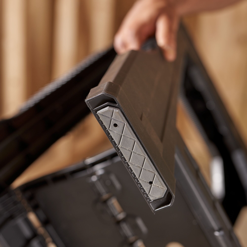Les tréteaux sont dotés de rainures en V intégrales pour maintenir solidement les pièces, qu'il s'agisse de bois ou de tuyaux. Le caoutchouc antidérapant sur les pieds assure une adhérence supplémentaire, rendant l'utilisation de ces tréteaux encore plus sécurisée. Une étagère intégrée en bas des pieds permet de garder vos outils et accessoires à portée de main, optimisant ainsi l'efficacité de votre espace de travail. Ces tréteaux sont également légers, facilitant leur transport d’un site à un autre.