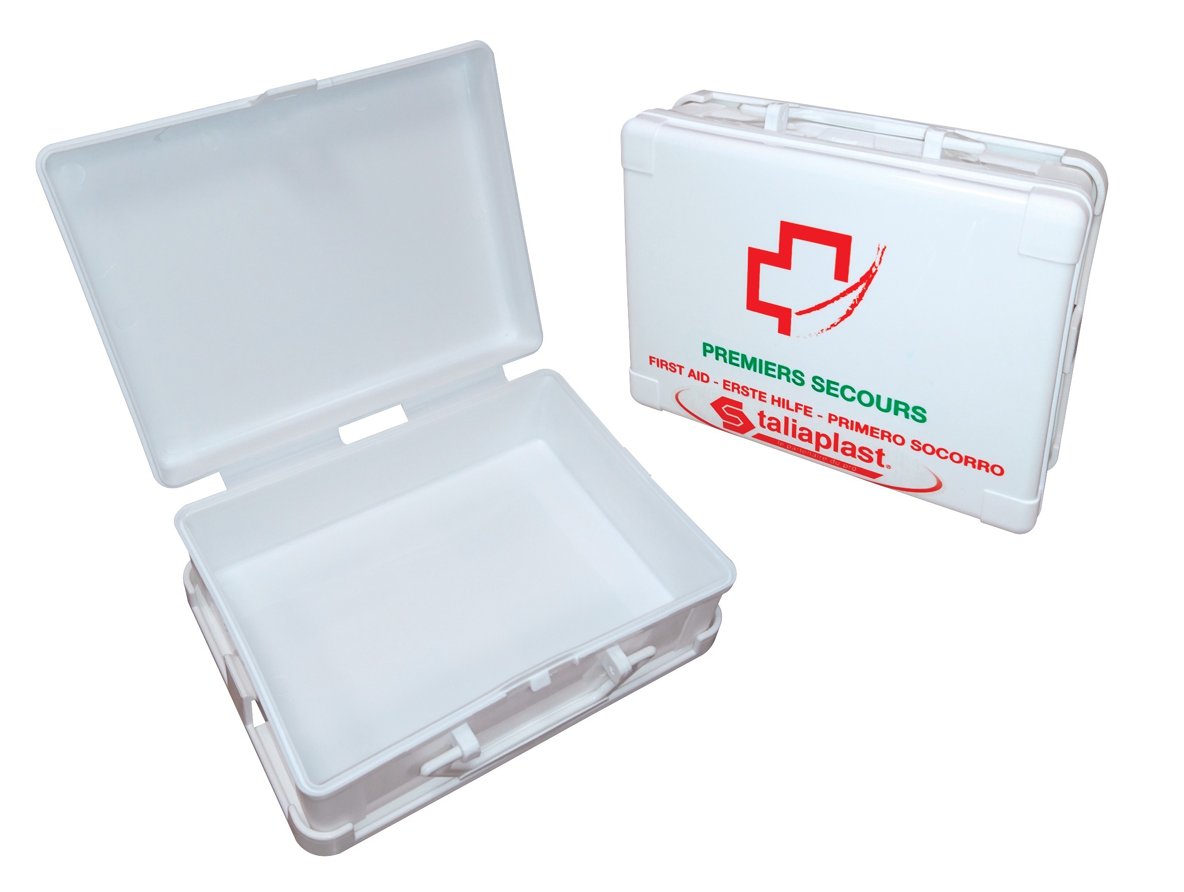 Coffret en polypropylène blanc avec poignée et support mural.Composition : pansements, 1 paire de ciseaux inox, pince à échardes, bandes extensibles, pansement compressif stérile, compresses non tissées, sparadrap, gants vinyle, tampons alcool, tampons chlorhexidine, sérum physiologique, 1 feuillet 1ers soins. 2 modèles.