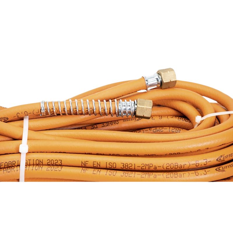 D’une longueur de 20 mètres et d’un diamètre intérieur de 6,3 mm, il est équipé de raccords sertis 3/8G femelle gauche et d’un ressort anti-casse ingénieusement intégré au niveau de la sortie de manche. Ce dispositif, testé sur de nombreux chantiers d’étanchéité en France et en Europe, limite efficacement les risques de pliure, de cassure ou d’arrachement au niveau des extrémités – des causes fréquentes de remplacement prématuré.