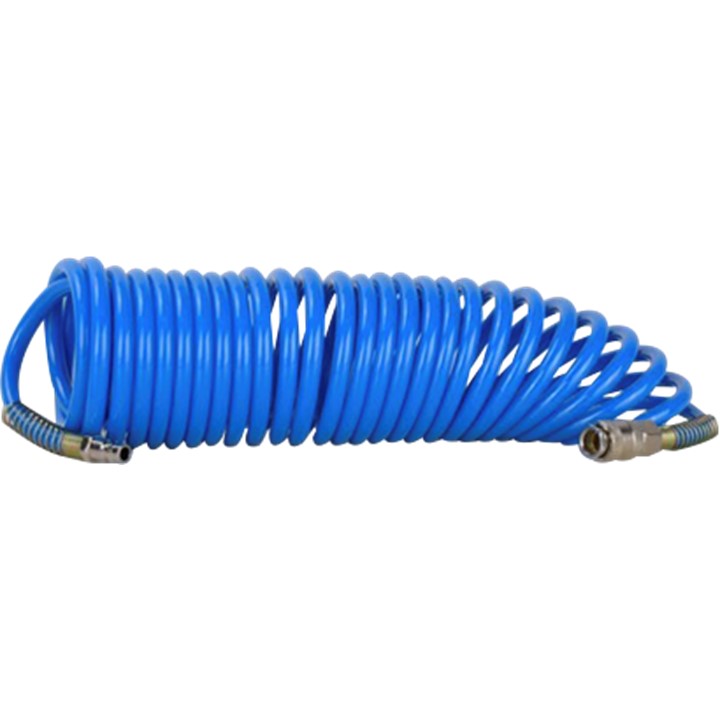 Tuyau spiral Ø 6,5 X 10mm, longueur 7,5m, tuyau polyuréthane, pression max: 10bar, bonne résistance aux torsions et à l'abrasion, connexions avec ressorts de protection, raccords rapides ISO.
