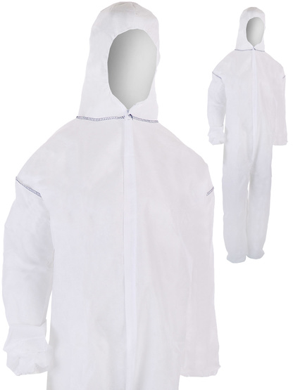 Combinaison de protection chimiqueNon-tissé SMS. 55 g/m² - Coutures surjetées Capuche 3 panneaux. Fermeture à glissière sous rabat auto-adhésif. Serrage élastique à la taille, aux poignets et aux chevilles.Propriétés électrostatiques.Coloris blanc. Usage unique.- Type 5 (EN ISO13982-1)- Type 6 (EN13034)
