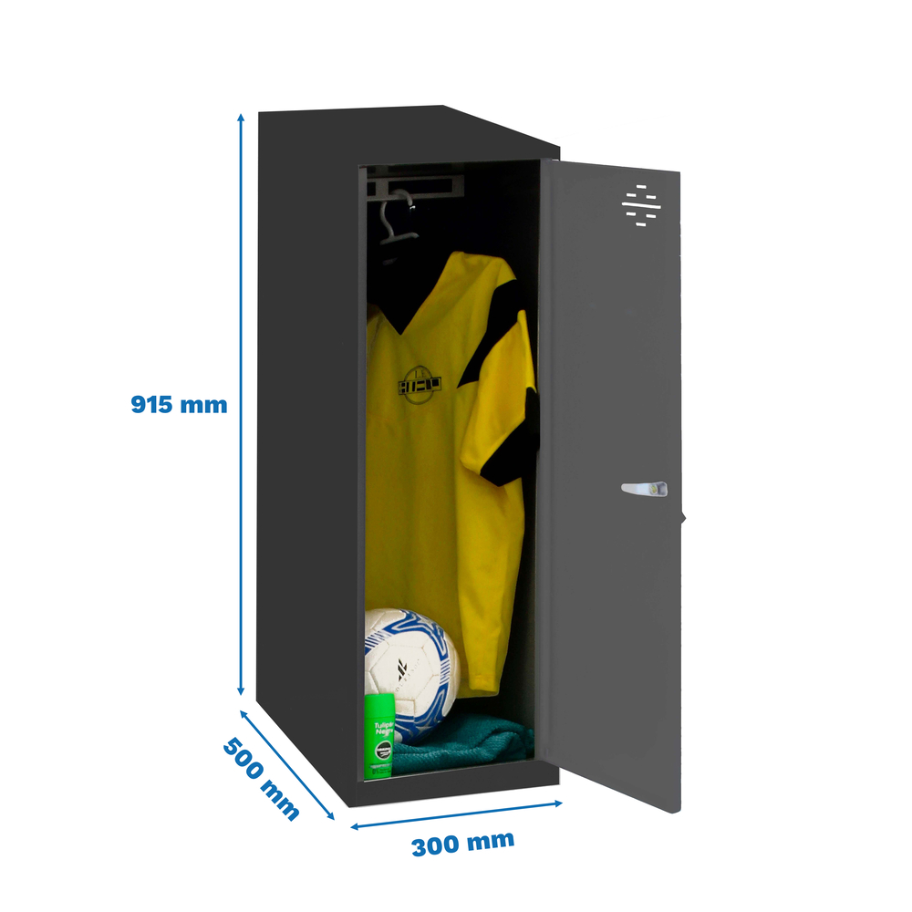 Le vestiaire mesure 915 mm de hauteur, 300 mm de largeur et 500 mm de profondeur, offrant un espace de rangement optimal. Sa finition anthracite élégante s'intègre facilement dans tout type d'intérieur et garantit une durabilité dans le temps, résistant aux chocs et à l'usure quotidienne.