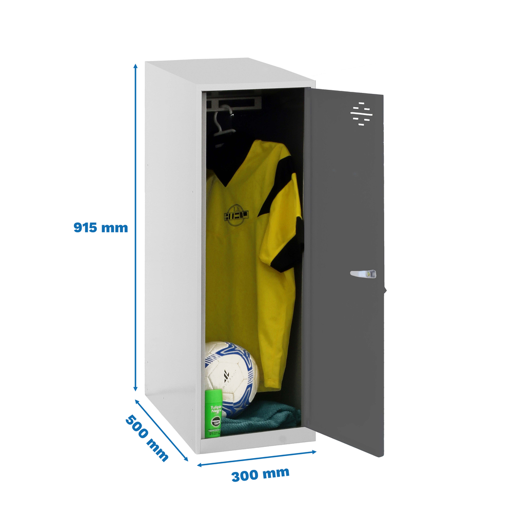 Ce vestiaire dispose de dimensions compactes de 915 mm de hauteur, 300 mm de largeur et 500 mm de profondeur, ce qui le rend idéal pour les espaces restreints. Sa finition en bleu et anthracite assure une intégration harmonieuse dans divers environnements. Conçu pour une durabilité optimale, il offre un stockage sécurisé pour vêtements et effets personnels.