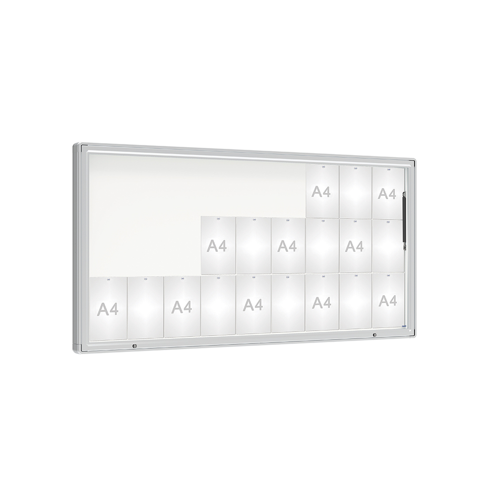 Ses dimensions généreuses de H 1000 x L 2010 mm, ainsi que sa finition intérieure en tôle galvanisée laquée blanche et son fond gris clair, ajoutent une touche moderne. L'étanchéité est assurée par un joint élastomère, et le cadre en aluminium est proposé en anodisé argenté ou peint selon votre choix. La vitrine est fixée au mur et des aimants Procity sont fournis, avec une option d'ajouter des piètements, un bandeau-titre ou un éclairage LED pour améliorer encore la visibilité de vos documents.