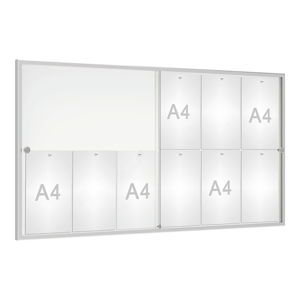 Cette vitrine est dotée de deux portes coulissantes, permettant un accès facile à vos documents sans entraver la circulation. Elle peut contenir entre 8 et 12 feuilles au format A4. Pour une installation optimale, elle se fixe au mur, garantissant un maintien sécurisé tout en facilitant l'affichage.